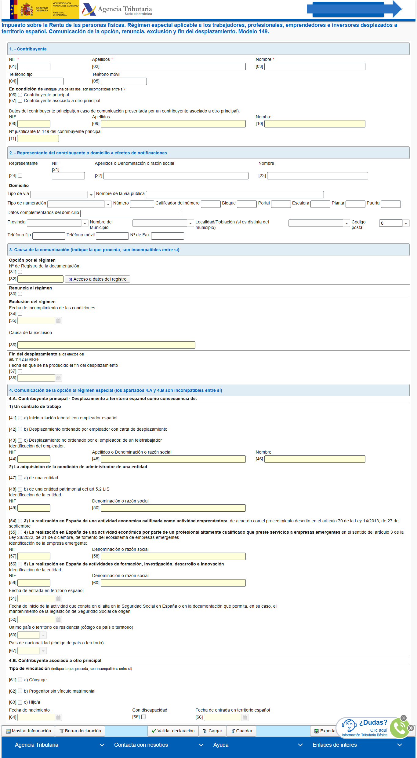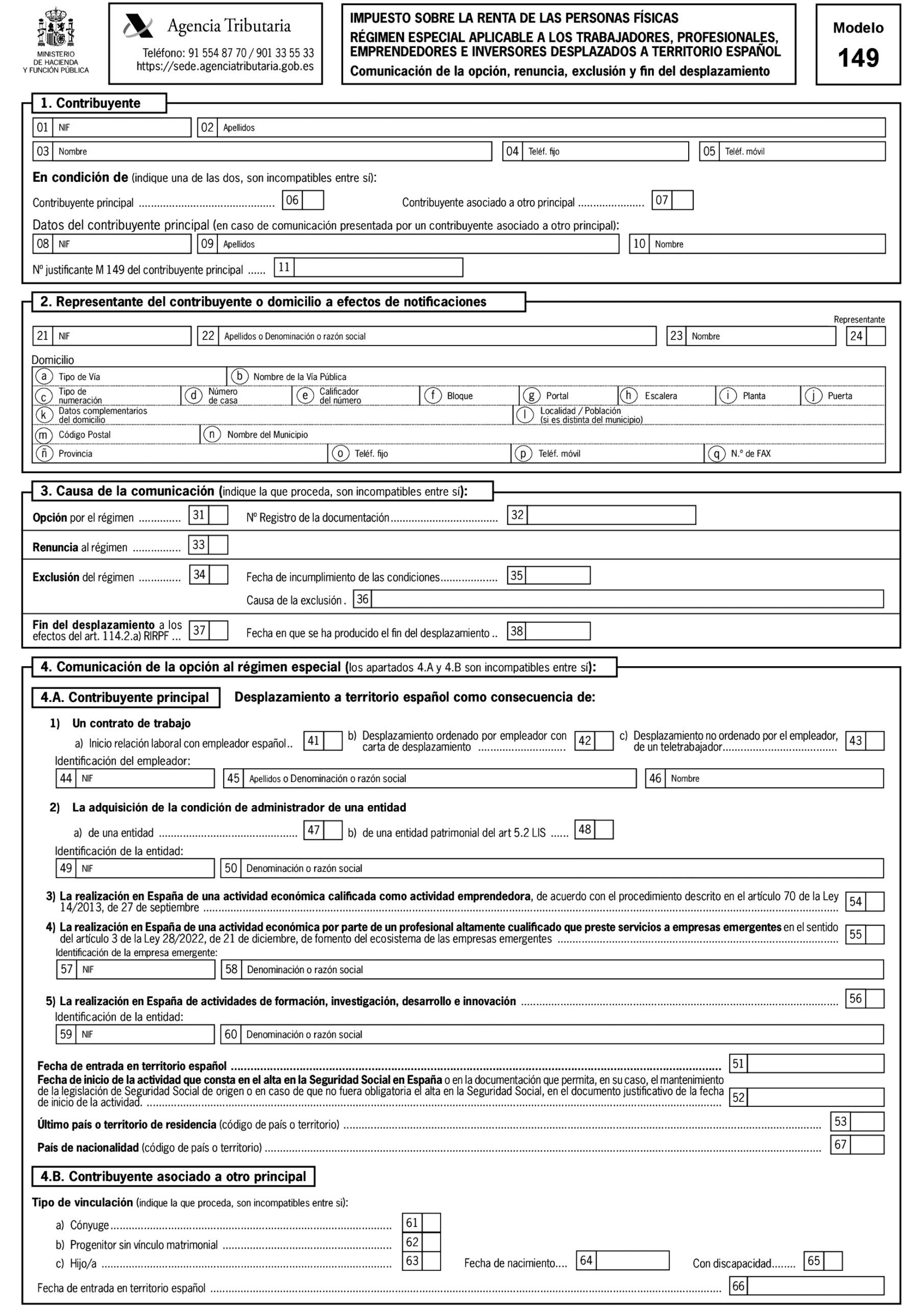 Form 149. IRPF. Special Regime for Workers, Professionals, Entrepreneurs, and Investors Moving to Spanish Territory. Communication of the Option, Renunciation, Exclusion, and End of the Move.