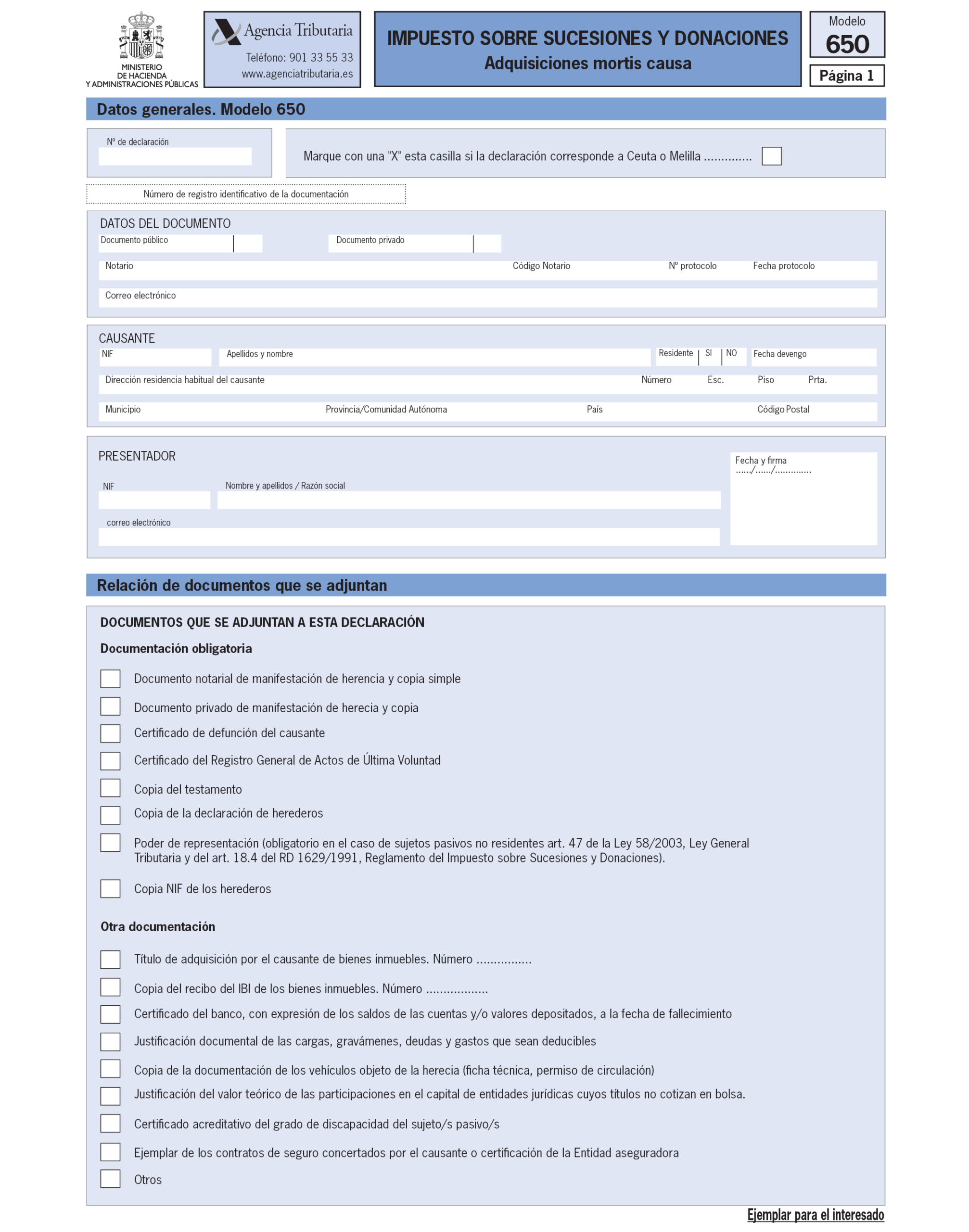 | Acquisitions Due to Death (Succession) | Form 650 | Acquisition of assets and rights by inheritance, bequest, or life insurance proceeds (when the policyholder is different from the beneficiary). |